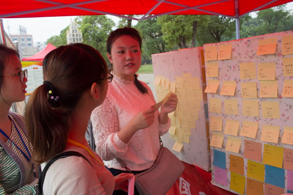 迎新点放置了两个贴满纸片的箱子。学生会的成员以及各班的志愿者将自己的联系信息写在卡片的上面,贴在活动箱上,卡片信息包括,姓名,性别,班级,家乡地址,QQ号,微信号,寄语,在迎新当天供新生随机选取。选取对接后学长学姐将充当小鲜肉的“私人管家”,为他们解疑答惑,并提供更为详尽的指导。