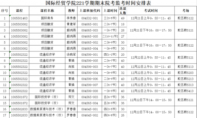 2022-2023学年第一学期国际经贸学院考试安排如下,包含考试的时间、教室安排,请有相应考试的同学按时参加考试。