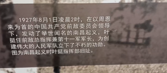 走近叶挺指挥部旧址,我看到的是保存完好的指挥部、军需处等等,看到在桌子上摆放的煤油灯仿佛穿越回曾经的南昌起义现场,感受到现场的大战一触即发的紧绷。此地建于1927年7月下旬,距今有近百年的历史,被保留在校园的旧址在这百年间不仅见证了战争的炮火,也见证了中国新希望身上的星星之火。老区新貌,烈阳下的少年也在前辈的见证下积攒着为党、为国家、为人民奋斗的力量。负责看守叶挺指挥部旧址的安保人员认真负责,同步运用新技术对来往人员进行帮助预约登记活动,在进行研学过程中,负责叶挺指挥部旧址的人员认真负责,保留完整的残存旧物不仅是当代人对于过去红色精神的保护更是在践行在孤独生命里坚守信仰的红色精神的传承。