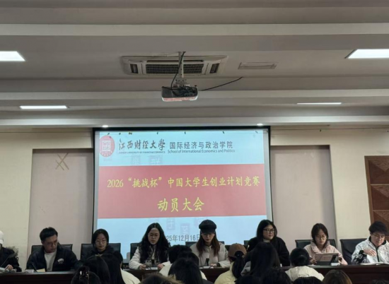 凝聚科创力量、激发学子斗志。12月16日,国际经济与政治学院在江西财经大学蛟桥园北区翼轸楼3222室顺利开展江西财经大学2026年“挑战杯”中国大学生创业计划竞赛动员大会。本次大会旨在激发全院师生的科研创新热情,深化对“挑战杯”赛事重要性的认识,鼓励广大学生积极参与,以实际行动推进学校创新人才培养体系的建设。此次动员大会邀请了院团委书记周妍出席,院内各年级同学积极参与。